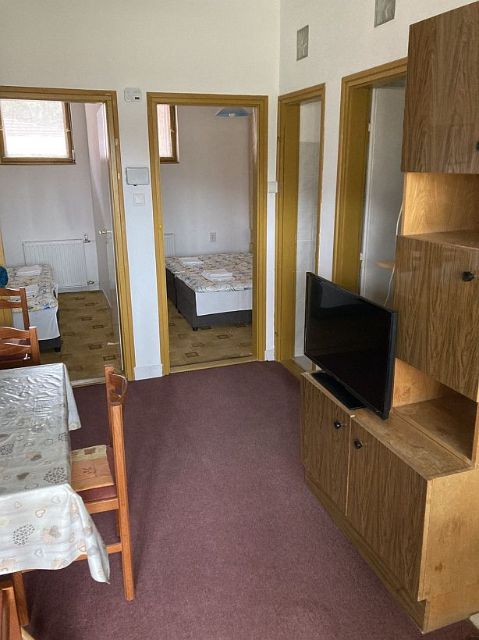 A földszinten található. 2 hálószoba (2 x 2 ágy), nappali (2 személyes heverővel, mely függönnyel leválasztható), fürdőszoba zuhanyzóval és WC-vel, külön WC, konyha, (teljes felszereléssel, mikrohullámú sütővel) hűtő, étkező sarok található benne. TV, fedett terasz, parkoló tartozik az apartmanhoz. Klíma térítés ellenében használható.