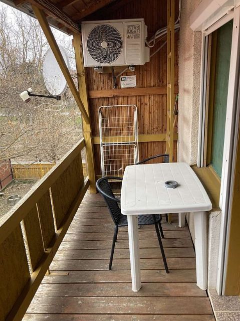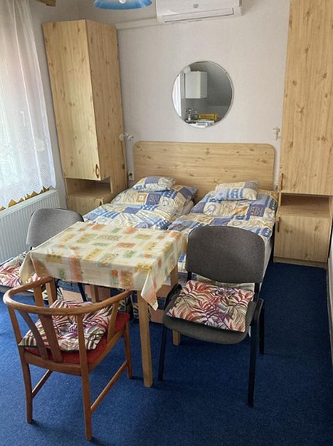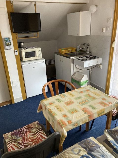 A felső szinten az udvar felőli oldalon található. Az apartman 1 szobából áll, melyben 2 ágy és egy pótágy (csak 170 cm hosszú) található. A szobában konyhasarok van, mely alapvető felszereltségű. Fürdőszoba zuhanyzóval WC-vel, TV, hűtő, mikro található az apartmanban. Az apartmanhoz fedett terasz tartozik.